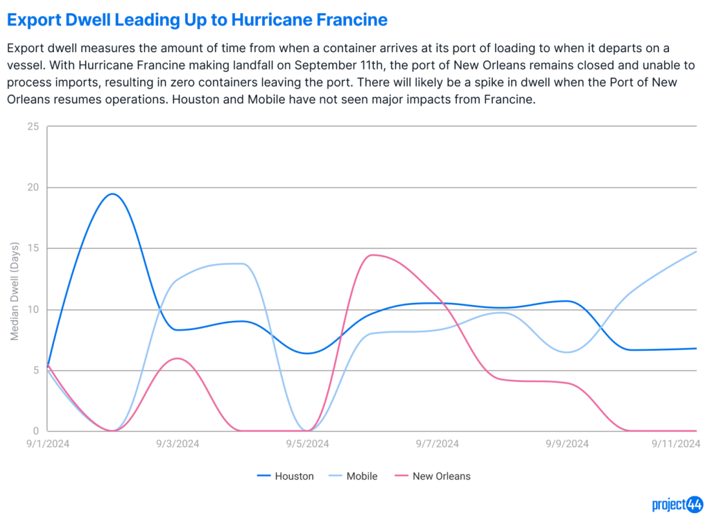 Similarly to import dwell, New Orleans has not processed exports in the past two days, and with the port closed today, it will mark at least three days without any container activity. This will lead to an increase in export dwell times once the port reopens. The ports of Mobile and Houston have continued operations and are not expected to experience major disruptions.