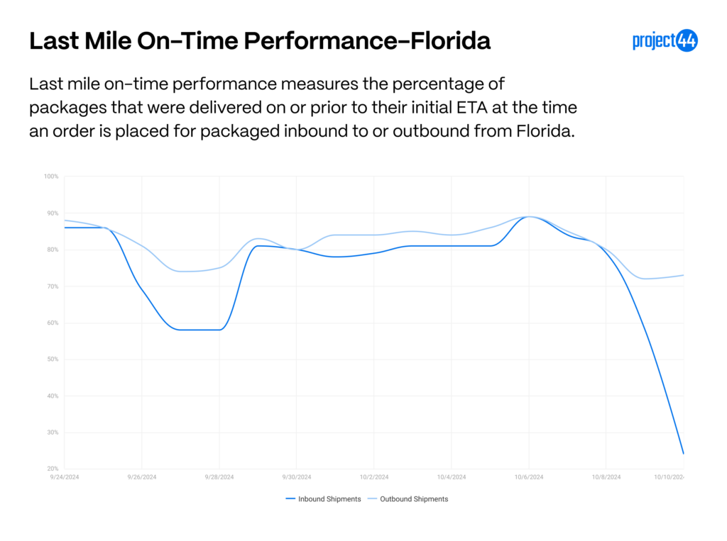 Already, inbound shipment performance has dropped to levels seen during Hurricane Helene, falling from nearly 90% a few days ago to just 58%. Outbound shipment performance is even lower than during Helene, currently at 73%. These rates are likely to remain low as road clean-up continues and residents return from evacuation.