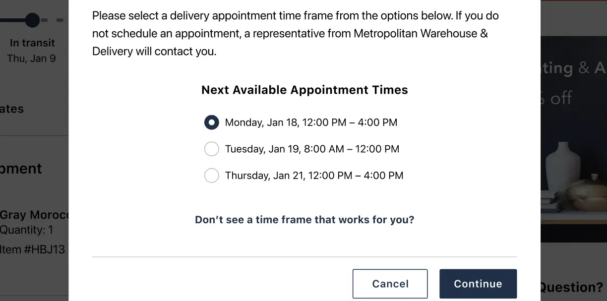Fournissez à vos clients un moyen transparent et efficace de planifier des rendez-vous pour l’installation, directement à partir de la page de suivi.