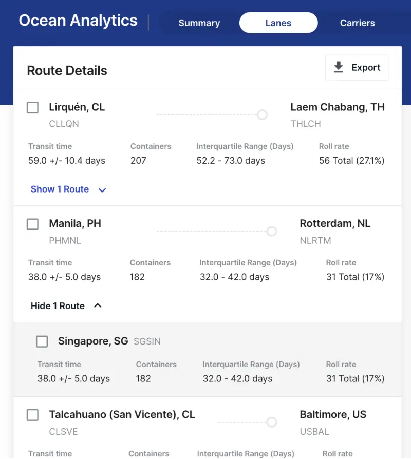 Nutzen Sie die größte Datenbank von Schiffen und Serviceplänen, um Ihnen bei der Auswahl der richtigen Kapazitätsoptionen zu helfen. Verwenden Sie integrierte Dashboards, um die Vorlaufzeiten des Bestands zu planen und überschüssige Puffertage zu vermeiden.